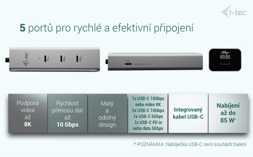 i-tec USB-C Charging Metal HUB 5port with USB-C video 8K, Power Delivery 85W