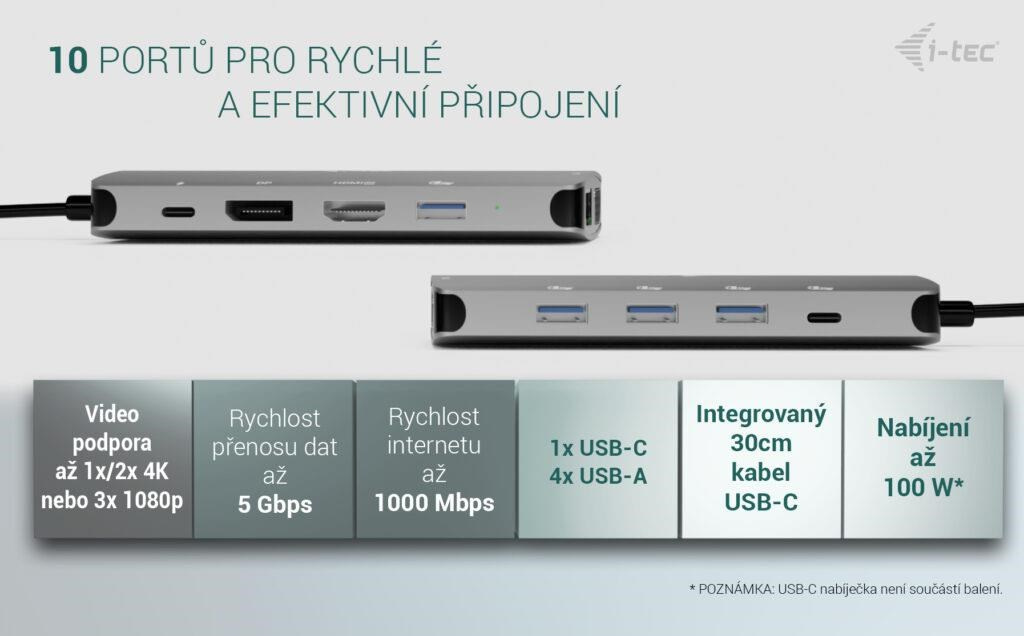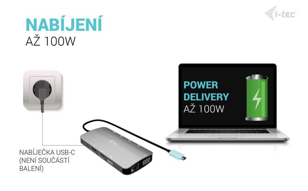 - Power Delivery až 100 W – napájení notebooku přes USB-C
