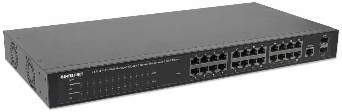 Intellinet 24-portový gigabitový prepínač s webovým riadením PoE a 2 portami SFP (240 W), 24 portov PoE+/PoE 802.3at/af