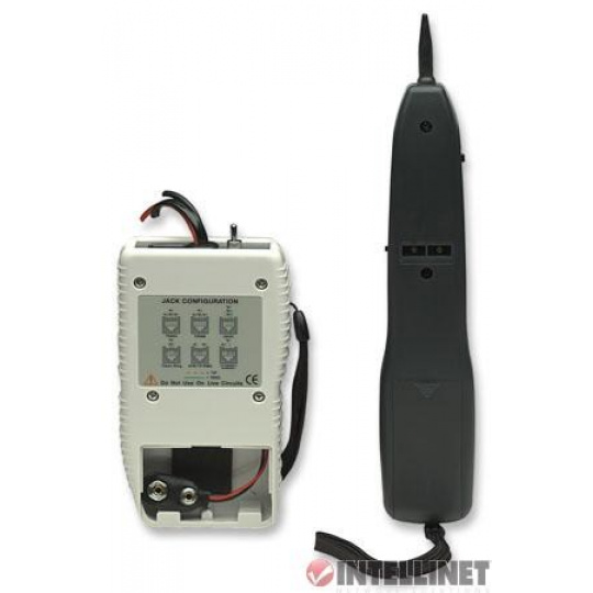 Net Toner and Probe Kit Tone Generator [515566] •Tests datacom, telecom, security, video, and audio networks •Two position switch for single or multi-tone signal •LEDs for line polarity, continuity and voltage •Enhanced talk battery mode provides power for voice communications over inactive pairs •Testing leads and modular cables for individual wire tests or modular jack tests •Replaceable plastic tip to prevent accidental shorts •Trace or identify wire or cables in a bundle or group •Alligator clips, RJ45 jack, RJ12 plug, optional F-connector Color •Beige Specifications •Net Toner •Toner Frequency: High alternating 500-781 Hz ; Low alternating 446-657 Hz •Talk Battery: 9V into a 600 ohms circuit •Voltage protection: 50 VDC or 24 VAC •Battery: 9V DC standard or alkaline •CE Approved: EN 55022 Class B for ITE and EN 55024 •Size: 125 (L) x 68 (W) x 26 (H) mm (4.9 x 2.7 x 1.2 in.) -Hmotnosť: 120 g (.37 lb) Čistá sonda -Zosilnenie: 30 db -Odolnosť hrotu: 30 ohmov (plastový hrot) -Batéria: 9 V DC štandardná alebo alkalická -Schválenie CE: EN 55022 Trieda B pre ITE a EN 55024 -Veľkosť: 210 (D) x 40 (Š) x 28 (V) mm (8.1 x 1.6 x 1 palec.) -Hmotnosť: 140 g (.30 lb) Životné prostredie: -Prevádzková teplota: 0 - 40 °C (32 - 104 °F) Obsah balenia -Sieťová sonda -Sieťový toner s krokosvorkami a konektorom RJ-12 -Ženský F-konektor na adaptér RJ-45 -Prepravné puzdro -Užívateľská príručka..