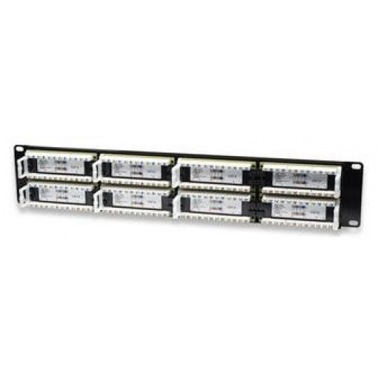 Patch panel Cat6 48-portový, UTP, 2U Farba: čierna -Solidné a spoľahlivé ukončenia pre medenú kabeláž s minimálne 3 mm 50 mikročlánkovými pozlátenými kontaktmi jack -Kompatibilný s nástrojmi na dierovanie 110 aj Krone -Podporuje 22 až 26 AWG splietaný a plný vodič -Na použitie s netienenou krútenou dvojlinkou (UTP) Cat6 -Ideálny pre sieťové aplikácie Ethernet, Fast Ethernet a Gigabit Ethernet -Pripojí 48 portov RJ-45 k sieti -Zaberá výšku 2U racku -Spĺňa štandardy pre montáž do 19" racku..