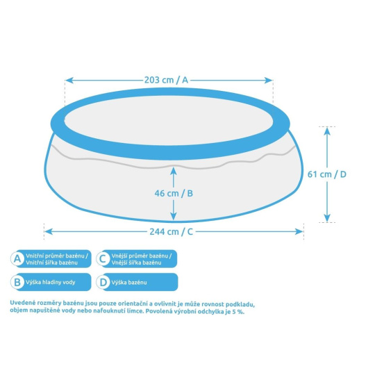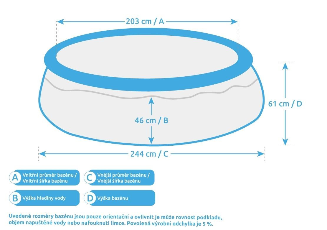 Uvedené rozmery bazénu sú iba orientačné a môžu ovplyvniť rovnosť podkladu, objem napustené vody alebo nafúknutie límca. Povolená výrobčná odchýlka je 5 %.