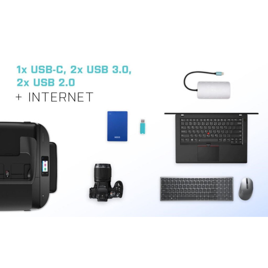 - 2x USB 3.0, 2x USB 2.0 a 1 port USB-C vám umožní jednoducho pripojiť zariadenia USB a periférne zariadenia.