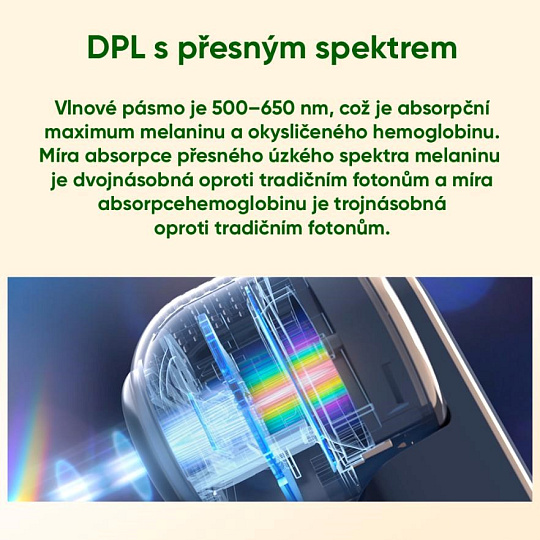 - Vyššia účinnosť než IPL: DPL technológia má 2x efektívnejšiu absorpciu melanínu a 3x efektívnejšiu absorpciu hemoglobínu než tradičné IPL.