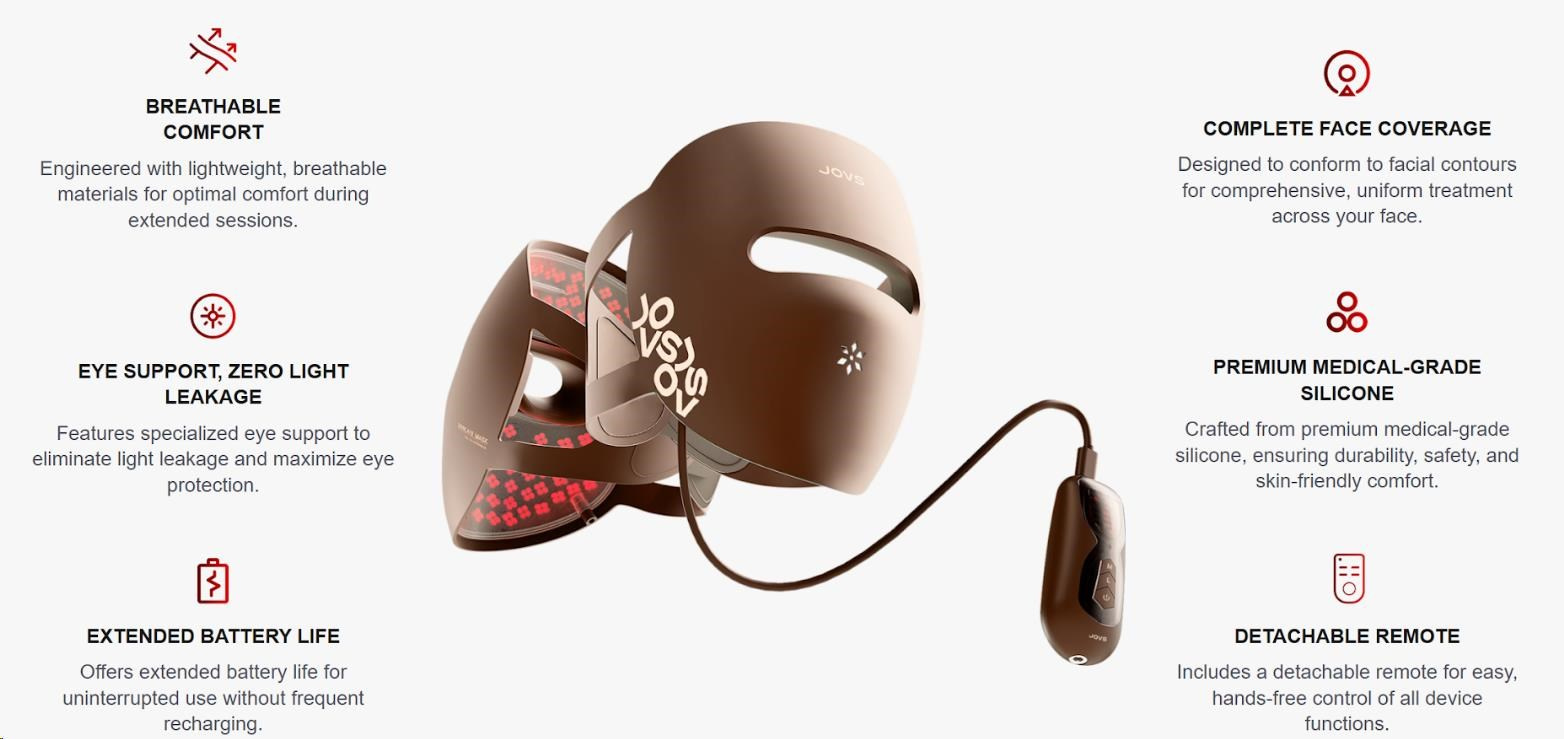Predstavte si pleť, ktorá je deň čo deň čistejšia, pevnejšia a viditeľne mladšia. S maskou JOVS sa táto vízia stáva realitou. Vďaka pokročilej optickej technológii s 98% účinnosťou prenosu svetla energia preniká hlboko do pokožky a prináša viditeľné výsledky už za 4-6 týždňov pravidelného používania. S komfortným bezdrôtovým dizajnom sa váš denný rituál stane chvíľou relaxácie, na ktorú sa budete tešiť.