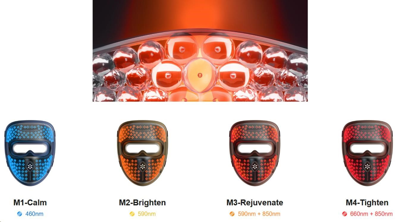 Tajomstvo účinnosti masky JOVS spočíva v kombinácii štyroch špecifických vlnových dĺžok svetla, ktoré sú inteligentne kombinované v 4 automatických režimoch (Calm, Brighten, Rejuvenate, Tighten) pre maximálne výsledky: