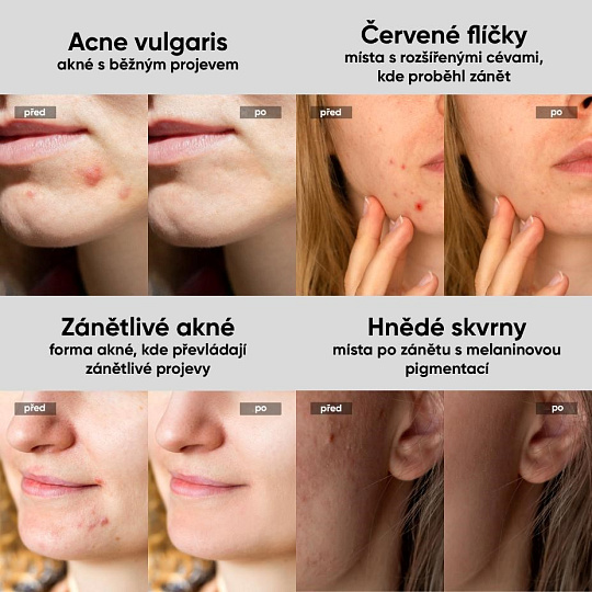 - Extrémne rýchle ošetrenie: Upokojenie jedného pupienka za 6 sekúnd, ošetrenie celého obliea za menej ako 3 minúty.
