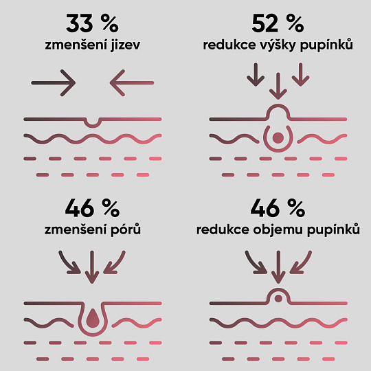 - Klinicky overená účinnosť: Likviduje viac ako 99 % baktérií Propionibacterium acnes, znižuje kožný maz o 56 % za 3 dni a zmenšuje objem akné o 63 % za 7 dní.