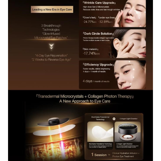 Očné okolie je najjemnejšia a najzraniteľnejšia časť nášho tváre, ktorá stárne až 8-krát rýchlejšie ako zvyšok tváre. Doprajte mu starostlivosť, ktorú si zaslúži, a objavte revolučné riešenie, ktoré prináša výsledky porovnateľné s profesionálnymi klinikami. Predstavujeme vám JOVS RevivaEye, prvé mikrokrystalické očné náplasti s technológiou "Blackthorn" a svetelnou terapiou na trhu. Značka JOVS opäť kombinuje špičkovú vedu a luxusnú starostlivosť, aby vám poskytla komplexné omladenie očného okolia z pohodlia domova.