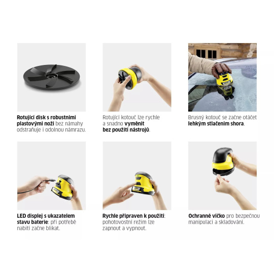 Už žiadne náročné vyprošťovanie auta z ľadovej kryštalickej vrstvy. Ruky nechajte pekne v teple rukavíc a uľahčite si prácu pomocou elektrickej škrabky na ľad EDI 4. Rotujúci kotúč s plastovými čepeľami pracuje rýchlo a hravo zvládne aj silnú námrazu, aniž by poškodil sklá. Stačí iba ľahko pritlačiť na zmrznutý povrch a ľad sa okamžite uvoľní. Prípadné opotrebenie čepeľí ľahko vyriešite výmenou za nový nástavec, ktorý si môžete zakúpiť v sekcii náhradných dielov. Výmena je veľmi jednoduchá a zvládnete ju aj bez náradia. Po použití škrabku jednoducho uložíte do ochranného krytu, ktorý zabráni jej mechanickému poškodeniu. Stav batérie ľahko overíte pomocou LED signalizácie, ktorá vám bliknutím oznámi nutnosť dobitia. Pridajte k nákupu ešte letnú sadu nástavcov a zo škrabky sa počas pár ťahov stane čistička skiel.