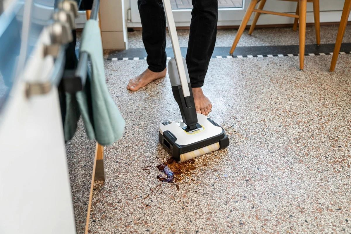 ** Čistič podláh Kärcher skracuje dobu čistenia až o 50 %, pretože bežné nečistoty z domácnosti možno odstrániť z tvrdých podláh v jednom kroku, bez nutnosti vysávania pred vytieraním.