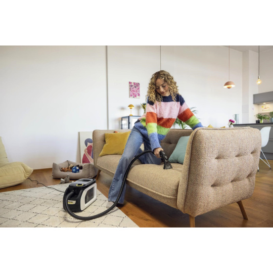 Hĺbkové čistenie a kompaktný dizajn: tepovač SE 3 Compact Home je výkonné, energeticky úsporné riešenie na čistenie textilných povrchov. Vďaka kompaktnému dizajnu je obsluha nielen jednoduchá, ale zariadenie je možné aj uskladniť na ušetrenie miesta, čo zabezpečuje, že je rýchlo pripravené na dôkladné a pohodlné čistenie hlbokých vrstiev vlákien aj pri nečakanom znečistení. Nečistoty z čalúneného nábytku, kobercov, behúňov a malých kobercov odstráni rýchlo a efektívne. Dlhá a flexibilná sacia hadica so zabudovanou hadicou na čistiaci prostriedok zaručuje veľké pohodlie a flexibilitu aj na ťažko dostupných miestach. Dlhý kábel zabezpečuje maximálny rozsah pohybu. Vďaka praktickým možnostiam uloženia na zariadení je všetko príslušenstvo vždy po ruke. Systém nádržky 2 v 1 zabezpečuje, že používatelia nemusia prichádzať do styku s nečistotami. A keď je upratovanie dokončené, extrakčný čistič s rozprašovačom ešte viac zaujme funkciou hygienického proplachu systému, ktorá zabraňuje tvorbe baktérií a zápachu. Súčasťou balenia je extrakčná hubica na čalúnenie, extrakčná hubica na šterbiny a čistiaci prostriedok.