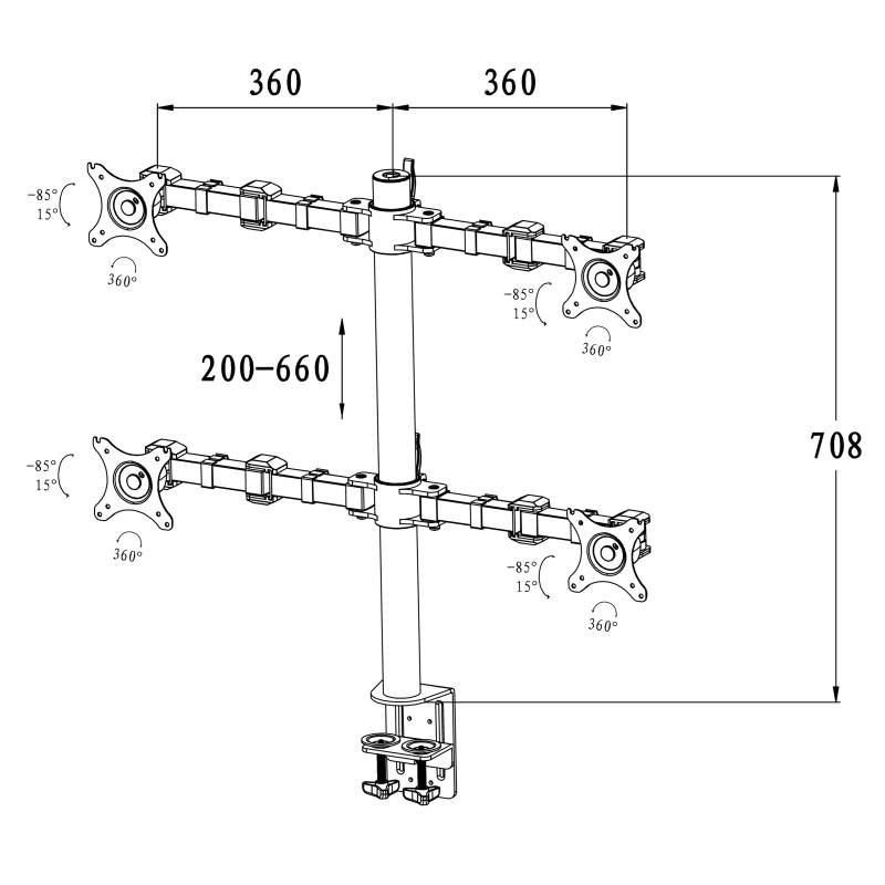 Kvalitný stolový držiak na 4 monitory Ergosolid NF44 Držiak na 4 monitory 10-30", nastavenie polohy, kvalitný, spoľahlivý a bezpečný, 2 typy uchytenia na stolové dosky, VESA 75x75 a 100x100, nosnosť 40kg Špeciálny držiak na 4 monitory pre vytvorenie monitorovej steny. Jednoduché nastavenie každého monitora do požadovanej polohy. Ideálne do kancelárií, callcentier, monitorovacích a sledovacích firiem, ostrahy objektov, IT špecialistov atď. Nosnosť 40kg, podpora VESA 75x75 a 100x100, nastavenie výšky, otáčanie do strán, náklon, rovina obrazoviek. Farba čierna. Záruka 3 roky. Stolový držiak na 4 monitory pre vytvorenie monitorovej steny, polohovanie jednotlivých monitorov, jednoduché nastavenie, vynikajúca kvalita - Ergosolid NF44 Technické údaje: nosnosť 40kg (4x10kg) podpora VESA štandardu 75x75 a 100x100 ideálny na monitory s uhlopriečkou 10" až 30" nastavenie výšky monitorov nezávislé polohovanie každého ramena zostavenie monitorov do roviny alebo do V otáčanie do strán náklon monitoru rotácia monitoru, korekcia roviny, možnosť preklopenia na výšku vysoká kvalita systém pre vedenie káblov spoľahlivý stolový úchyt farebné prevedenie čierne záruka 3 roky Lacný ale kvalitný, spoľahlivý a bezpečný držiak na 4 monitory 10-30 palcov - Ergosolid NF44 Držiak na 4 monitory Ergosolid NF44 podporuje VESA štandardy: VESA 75x75 VESA 100x100
