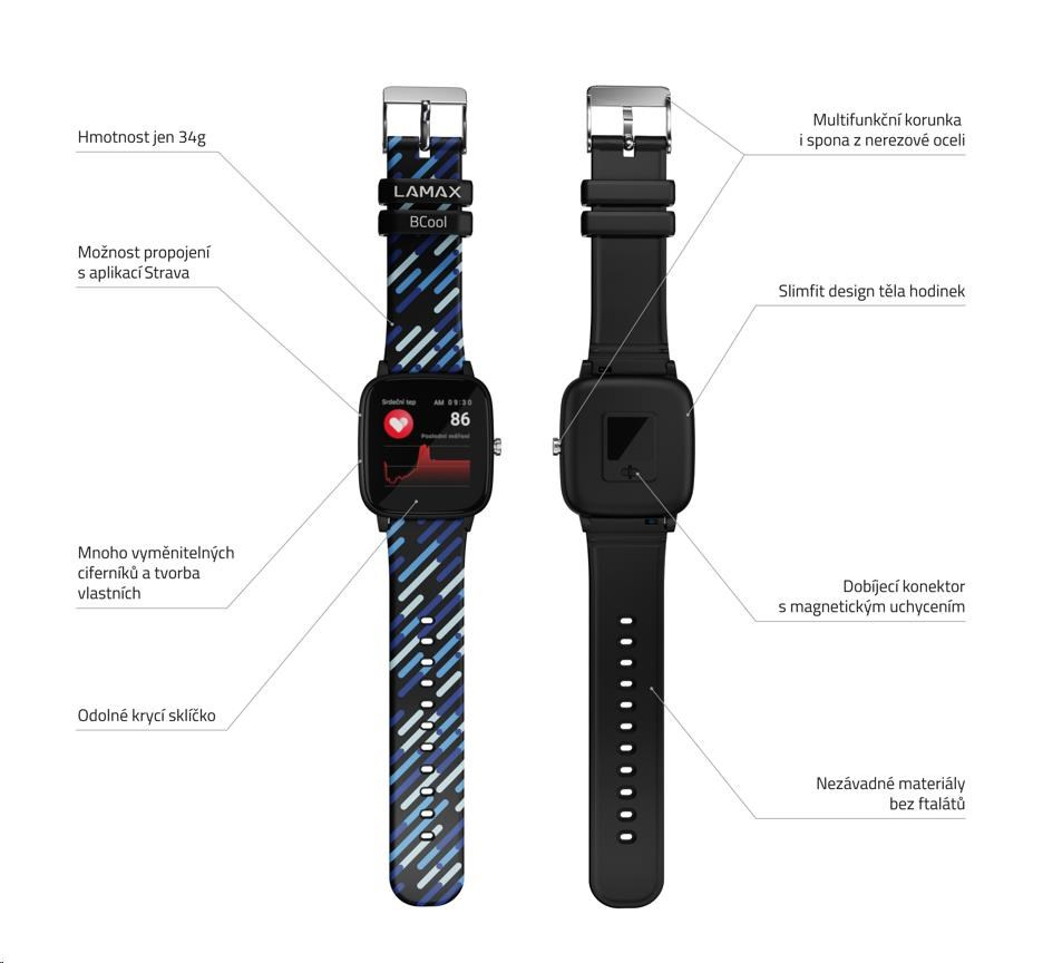 Šport a zábava na zápästíChytré hodinky LAMAX BCool sa stanú najlepším parťákom vášho potomka. S prémiovým dizajnom ohromí všetkých kamarátov, postarajú sa o ovládanie hudby a zabezpečia, že dieťa bude vedieť o všetkom dôležitom aj v momente, keď je lepšie nechať telefón v taške. Motivujte svoje ratolesti ku pohybu a odmeňte ich za splnené výzvy – hodinky im spočítajú celodennú aktivitu a zmerajú tep alebo spánok. S dvoma farebnými remienkami v balení a týždennou výdržou na batériu nešliapnete vedľa.