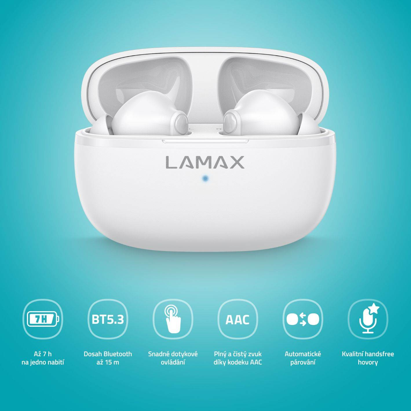 Kompaktné slúchadlá so štýlovým driekom vám presne padnú do ucha, zatiaľ čo elegantné nabíjacie puzdro bez námahy vkĺzne do každého vrecka.