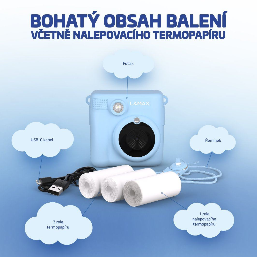Akonáhle foťák rozbalíš, môžeš začať dokumentovať dianie. LAMAX InstaKid1 je vybavený 2 rolkami termopapiera a navyše ešte 1 rolkou nalepovacieho termopapiera, takže behom chvíle vyrobíš parádne samolepky.. Aby tvoj nový parťák nikde nezostal ležať alebo ti nespadol, vďaka praktickej šnúrke ho môžeš mať stále pri sebe na krku. Foťák komunikuje v slovenčine a je len na tebe, či sa ti viac zapáči v modrom alebo ružovom prevedení. A keby ti to bolo málo, môžeš foťák používať aj ako prehrávač MP3.