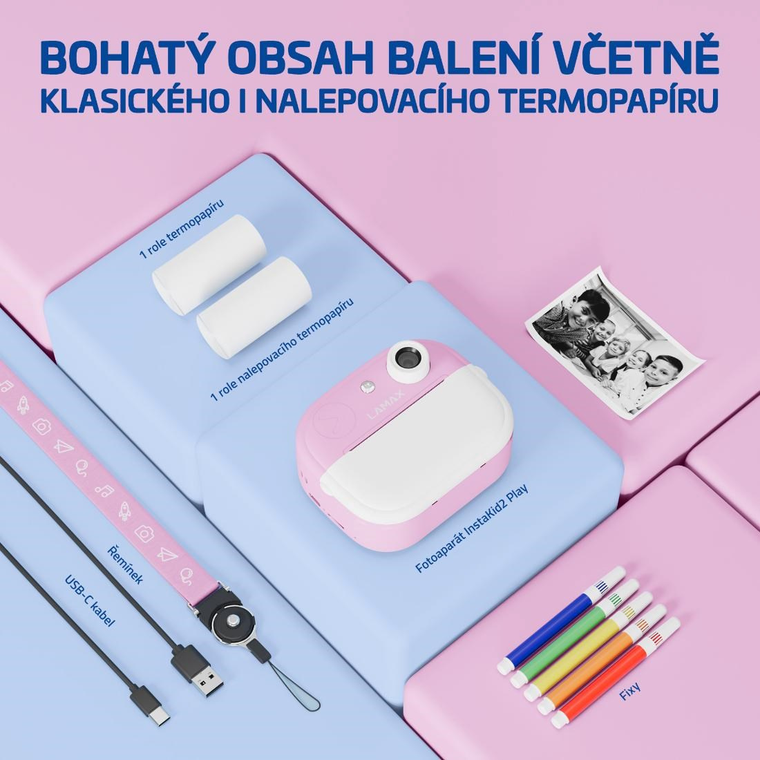 LAMAX InstaKid2 Play je foťák, ktorý nestráca čas. Deti si s ním jednoducho zaznamenajú každý dôležitý moment a počas sekundy ho majú v ruke. Čiernobiele snímky sa môžu premeniť na farebné spomienky pomocou fixiek, ktoré sú súčasťou balenia – stačí ich len vyfarbiť, pridať do vlastného albumu alebo nimi potešiť napríklad babičku. Vďaka jednoduchému ovládaniu, dvom ruličkám v balení (vrátane samolepiacej), originálnemu dizajnu a výkonnej kamere so 48 Mpx a FullHD videom, sa foťák stane nepostrádateľným spoločníkom na výlety, oslavy aj tvorivá popoludní s kamarátmi. Obľúbia si ho aj staršie deti, ktoré si môžu svoje snímky aj videá ukladať na microSD kartu a uchovať si tak svoje prvé filmárske pokusy. Na výber je ružová alebo modrá varianta a nechýba ani praktická šnúrka na krk, aby mali deti foťák stále po ruke. A keď práve nefotí? Zábavu zaistí päť hier priamo vo fotoaparáte. Tento foťáčik totiž nie je len o spomienkach, je tiež o radosti, sebavyjadrení a fantázii.
