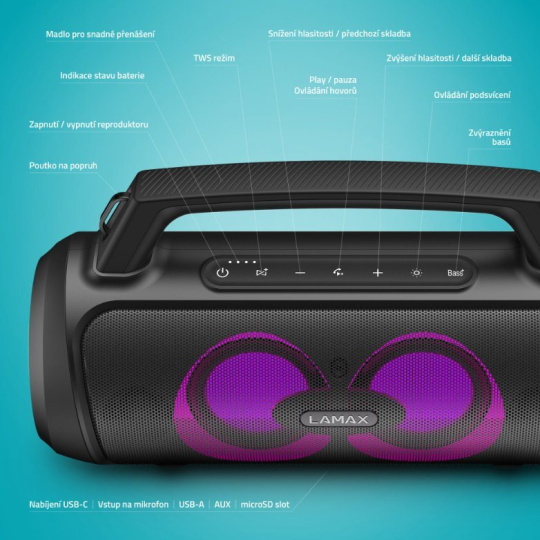 Malé telo s veľkým výkonomRozbehni kdekoľvek aj neplánovanú párty vo veľkom štýle. Prenosný párty reproduktor LAMAX PartyGo1 je vzhľadom malý, ale ukrýva v sebe veľkú silu, výkon 100 W. Technológia BeatBass® mu dáva silný, plný a bohatý zvuk. Grilovačku, narodeninovú oslavu alebo menšie párty oživia 3 režimy LED podsvietenia a možnosť pripojenia mikrofónu, keď si chceš užiť karaoke alebo akciu moderovať. Reprak sa automaticky spáruje s akýmkoľvek zariadením prostredníctvom Bluetooth 5.3, ktorý poskytuje bezchybný prenos až na 18 m. Na pohodu s tebou bude nový parťák aj cestovať, batéria mu vydrží až 20 hodín a má navyše šikovné madlo alebo popruh cez rameno. Pripojíš ho ako cez BT, tak USB, microSD, prípadne AUX a vie sa premeniť aj v powerbanku cez USB-A vstup. A keď jeden reprák nestačí, môžeš ho spárovať s druhým.