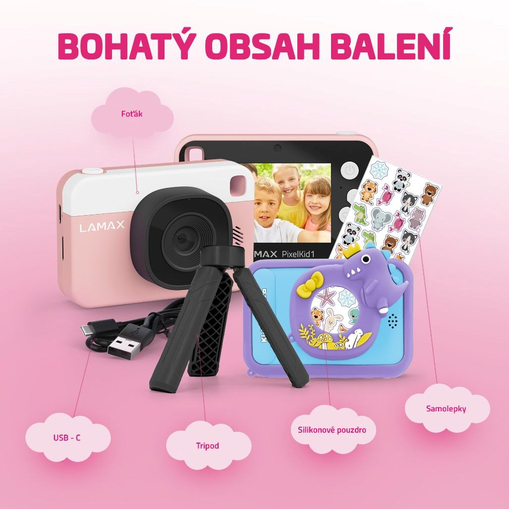 Prirodzenú detskú zvedavosť a kreativitu treba podporovať, preto prichádza LAMAX PixelKid1. Detský fotoaparát prispeje k rozvoju talentu malých fotografov, ktorí ho užijú na výletoch, rodinných oslavách alebo napríklad školských akciách. Okrem fotenia v rozlíšení 8 Mpx, zvláda foťák aj vytvorenie video záznamu vo Full HD a deťom ponúka aj päť rôznych hier na zabavenie, keď čakajú na záber. Pocit profesionality dodá menším aj väčším fotografom pribalený tripod a možnosť použitia niekoľkých filtrov a efektov na ozvláštnenie fotiek. Cool design v ružovom alebo modrom prevedení si dieťa okamžite zamiluje, a obzvlášť menšie ratolesti ocenia parádne silikónové ochranné puzdro s dinosaurom. Vlastný osobitý štýl potom foťáku dodajú nalepením samolepiek, ktoré nájdu v balení. Všetky záznamy vrátane autoportrétov zo selfie kamery sa ukladajú na microSD kartu. A ešte jednu šikovnú vlastností foťák vyniká, zvláda prehrávať MP3. Dieťa tak zaujme a zabaví po všetkých stránkach.