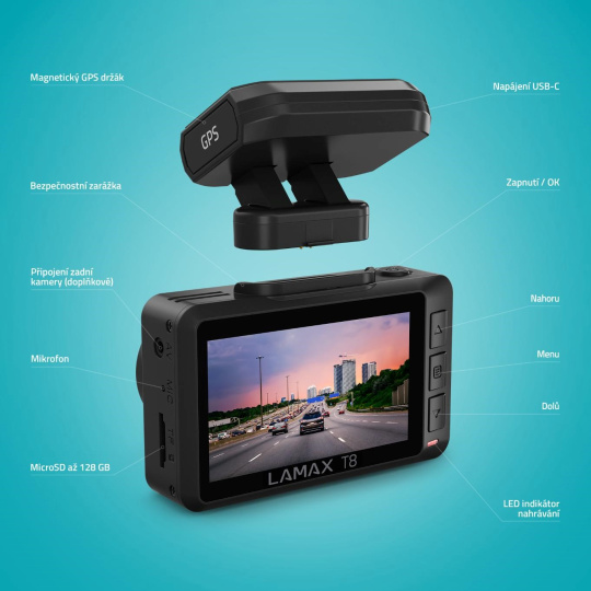 Jazdíš často, jazdíš rád, ale keď vidíš tú dopravnú džungľu, potrebuješ trochu istoty? Autokamera LAMAX T8 s 2K rozlíšením ti ju poskytne. Jej 170° uhol záberu zachytí dianie pred autom a v jeho okolí, takže keď sa niečo prihodí, máš na až 128 GB microSD karte jasný dôkaz pre všetky úrady a orgány. Spoľahlivá detekcia radarov prispieva k bezpečnejšej jazde, a navyše pokuty fakt nikto nechce. Manipuláciu s kamerou a jej stabilitu zaisťuje magnetický GPS držiak, na ktorý kameru zacvakneš a na 2.4" displeji si jednoducho navolíš všetko potrebné. Slovenské a prehľadné menu celý proces uľahčuje. Kameru môžeš cez Wi-Fi prepojiť aj s telefónom a apce potom záznamy spravovať. Pokiaľ ťa vždy trápila životnosť batérie, tak na ňu zabudni, táto kamerka je vybavená superkondenzátorom, ktorý zvládne aj striedanie teplôt, keď pôjdeš od mora za polárny kruh. Nabíjanie prebieha cez moderné USB-C. Zachyť každý okamih NA MAX.