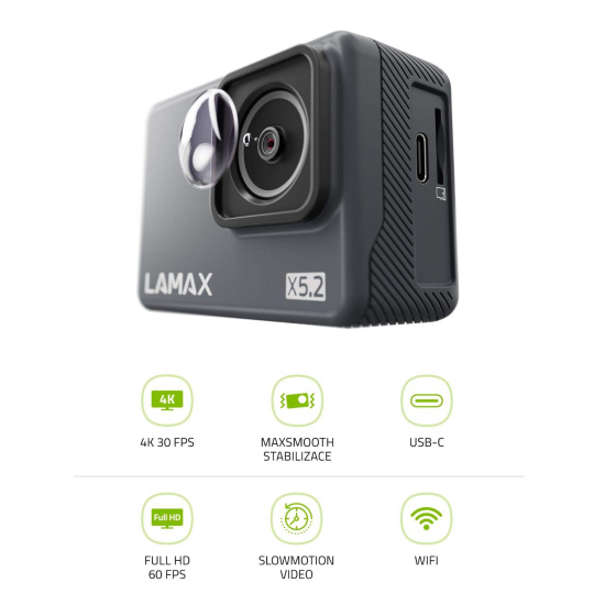 Tvoja kreativita bude jediným limitomZážitky sú v živote najviac, tak si ich uchovej aj inde ako len v hlave. Dokonalú pamäť až 128 GB má totiž aj akčná kamera LAMAX X5.2, ktorá s tebou vyrazí do každého dobrodružstva. Spätne si potom môžeš pozrieť všetky detaily v reálnom 4K 30fps. Nech už robíš čokoľvek, elektronická stabilizácia MAXsmooth sa postará o dokonale hladké zábery, takže celý obraz vo Full HD 60 fps je extra plynulý. Aby kľúčové momenty neutiekli príliš rýchlo, vie ich funkcia Slow motion spomaliť. Kamera je skvelý parťák nielen na súši, v puzdre sa s tebou potopí až do 40 m. Skrátka veľká paráda o vysokej kvalite za skvelú cenu.