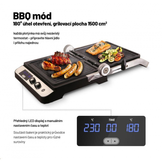 Platničky grilu majú nastaviteľnú polohu. Môžete napríklad upraviť výšku a sklon platničky tak, aby sa znížil tlak pôsobiaci na krehké suroviny, ako sú napríklad čerstvé ryby. V BBQ móde si pri každej platničke môžete nastaviť požadovanú teplotu ohrevu samostatne. S správnou voľbou teploty pre jednotlivé druhy potravín vám pomôže príložený sprievodca. Zároveň si pre každý pokrm môžete nastaviť požadovaný čas prípravy, takže sa nemusíte báť, že netrafíte správny stupeň prepečenia. Gril je vybavený funkciou automatického vypnutia, vďaka vysokému výkonu sa veľmi rýchlo zohrieva a o priebehu prípravy máte prehľad vďaka LED displeju. V ponuke sú aj ploché platničky pre ešte širšie možnosti grilu.