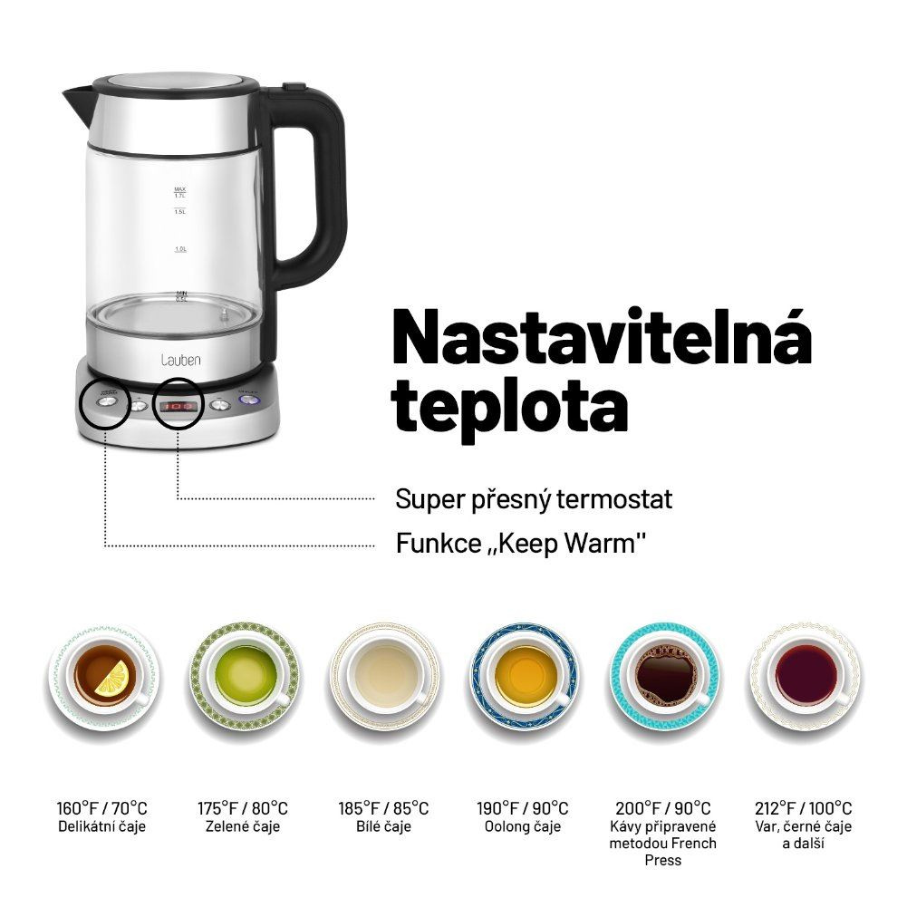 Teplota presne, ako má byťLauben Electric Kettle EK17GS je dizajnová rýchlovarná konvica s nastaviteľnou teplotou ohrevu vody a Keep Warm funkciou. Možnosť nastavenia teploty vody v kuchyni určite oceníte. Potrebujete zalejeť zelený čaj? Už nikdy nemusíte čakať, až voda vychladne, stačí si preferovanú teplotu zvoliť na prehľadnom LCD displeji.