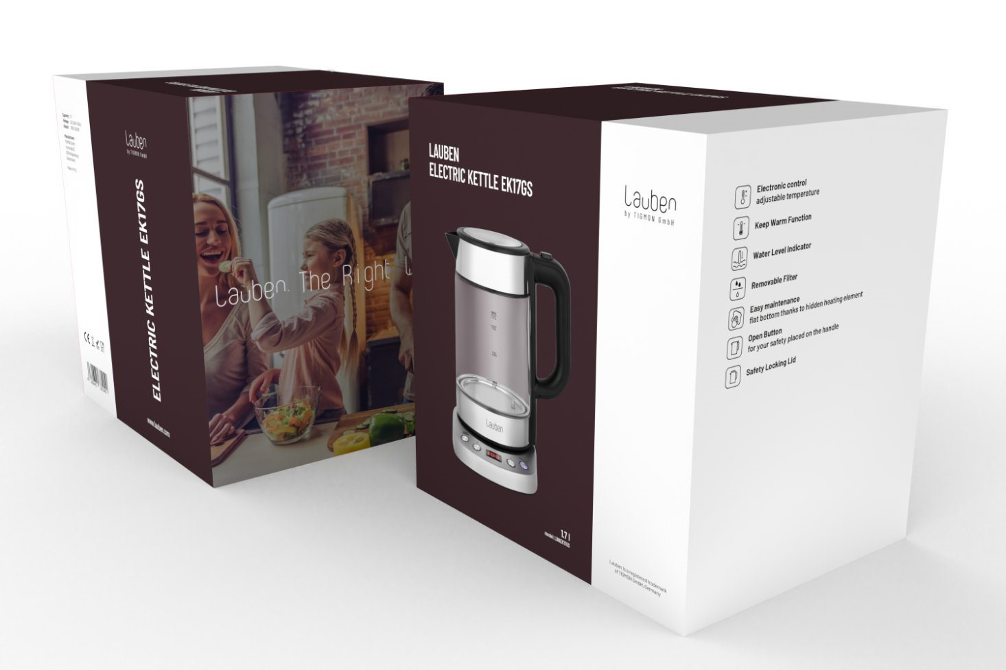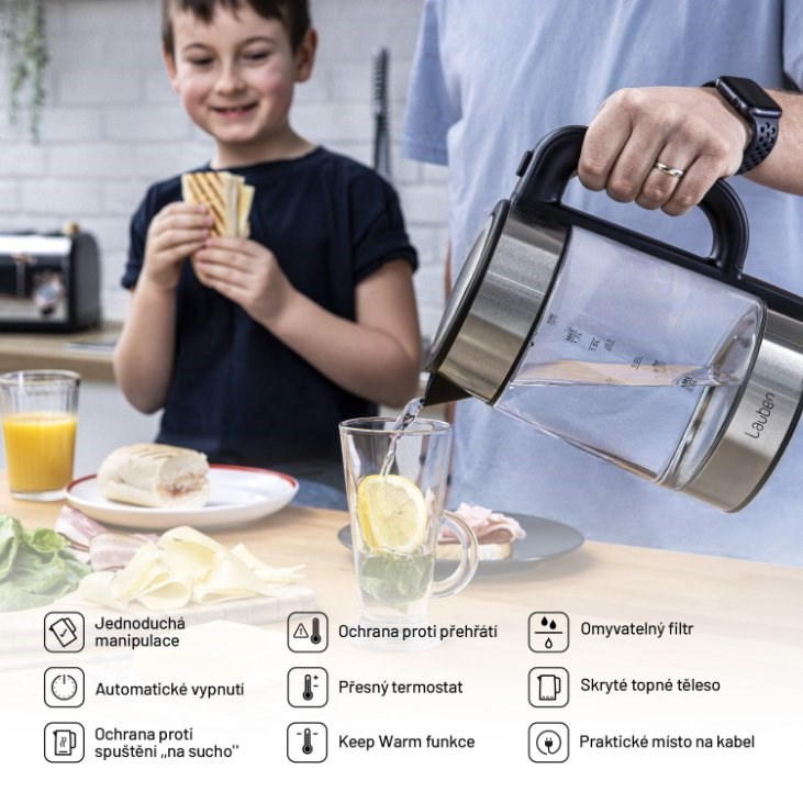 Teplotu volíte v rozmedzí 60-100 °C po desiatich stupňových intervaloch. V konvici Lauben ohrejete až 1,7 l vody naraz. Jej aktuálne množstvo vždy poznáte vďaka stupnici na skle. Veko konvice je vybavené bezpečnostnou poistkou proti rozliatiu a otvárate ho jednoducho, pomocou tlačidla umiestneného na držadle.