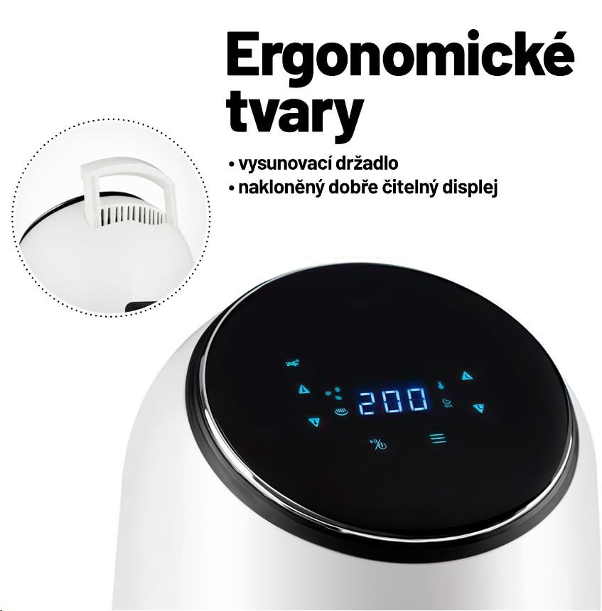 Ovládanie fritéry je intuitívne a zvládne ho každý. Požadovaný režim si nastavíte na dotykovom displeji, na ktorom môžete sledovať teplotu a dobu prípravy. Displej je navyše ideálne naklonený, takže na neho vždy pohodlne vidíte. Vyprážanú nádobu ľahko uchopíte vďaka praktickému držadlu, a keď skončíte s prípravou jedla, môžete ju bez problémov dať do umývačky riadu. Ak nemáte radi manuály, určite vás poteší video tutorial, ktorý spustíte naskenovaním QR kódu.