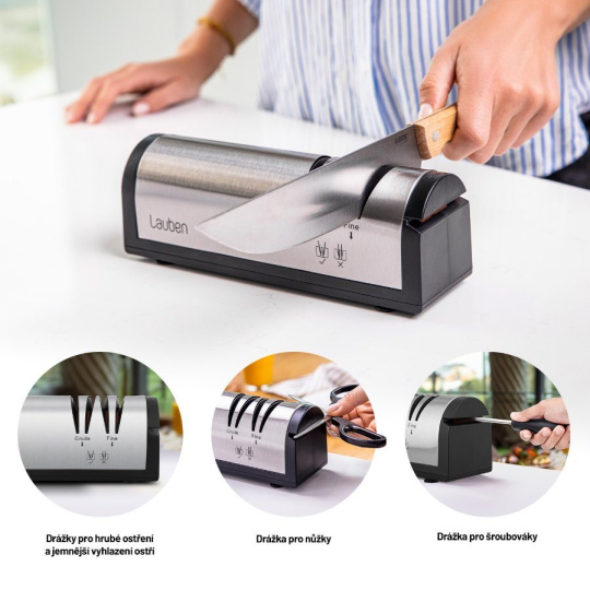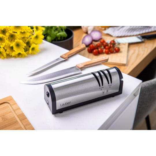 Vďaka Lauben Nôž na ostrenie 4700SB naostráte väčšinu nožov a sekáčov v pohodlí domova. Pridali sme aj špeciálnu zásuvku na brúsenie nôžok, aj s tými sa teda bruska Lauben poradí. Bruska umožňuje dva stupne brúsenia – hrubé a hladké doostrenie. Vďaka vodivým drážkam na udržanie správneho sklonu a optimálnemu brusnému uhlu 15° zvládnete dokonale naostriť každé ostrie ako profesionál. Stačí zapojiť brusku, spustiť ju a vložiť ostrie, ktoré chcete naostriť.