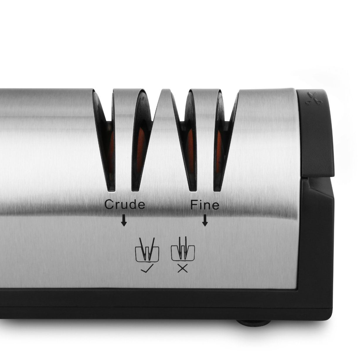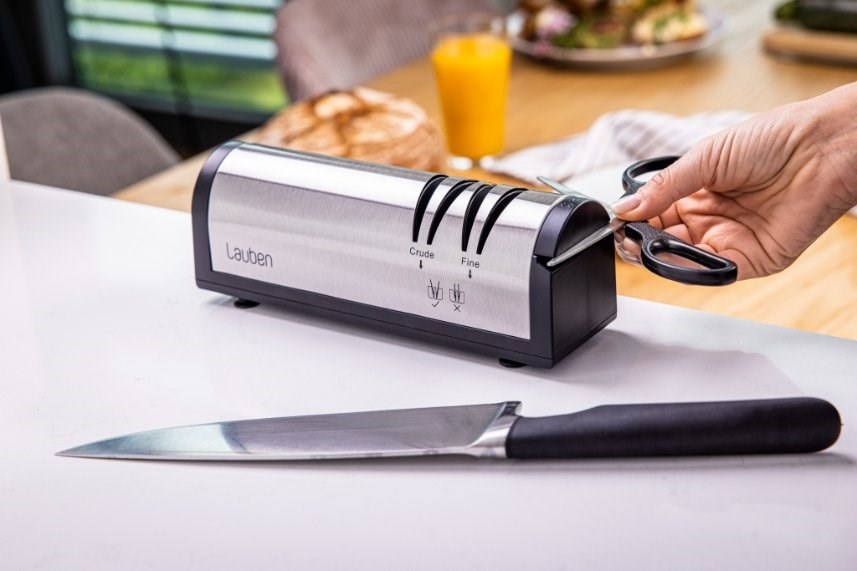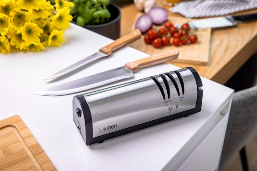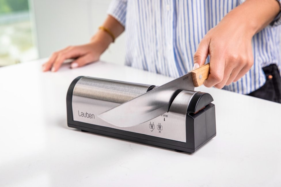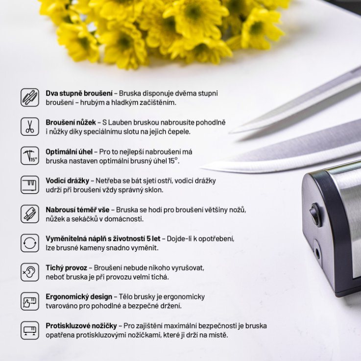 Vďaka Lauben Nôž na ostrenie 4700SB naostráte väčšinu nožov a sekáčov v pohodlí domova. Pridali sme aj špeciálnu zásuvku na brúsenie nôžok, aj s tými sa teda bruska Lauben poradí. Bruska umožňuje dva stupne brúsenia – hrubé a hladké doostrenie. Vďaka vodivým drážkam na udržanie správneho sklonu a optimálnemu brusnému uhlu 15° zvládnete dokonale naostriť každé ostrie ako profesionál. Stačí zapojiť brusku, spustiť ju a vložiť ostrie, ktoré chcete naostriť.