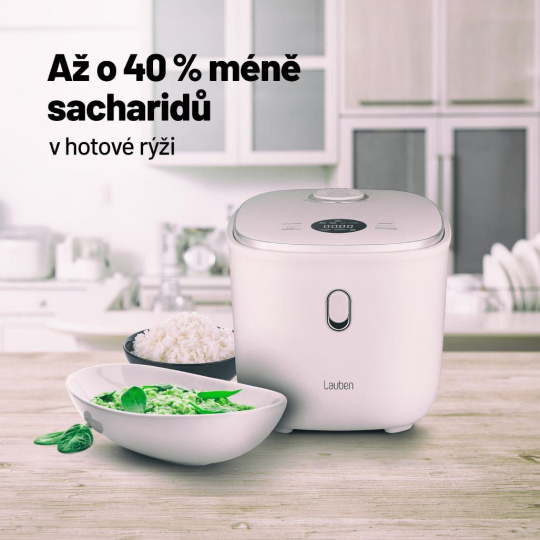 Zbaví vás až 40 % sacharidov v ryžiChcete jesť zdravšie, viacúčelový parný hrniec Lauben Low Sugar Rice Cooker 3000WT nesmie chýbať. Jeho funkcia low sugar zbaví ryžu až 40 % sacharidov. Prístroj si poradí so všetkými druhmi ryže, ale aj s ďalšími surovinami, napríklad strukovinami. Môžete si zvoliť zo 6 režimov, ktoré je však možné ručne upraviť. Prémiový neprilnavý keramický povrch jeho 3l nádoby pripraví jedlo pre celú rodinu bez nutnosti použitia tuku a obáv zo pripálenia. Poteší funkci Keep Warm, ktorá udrží pokrmy teplé bez nebezpečenstva rozvarenania, odložený štart či ochranu proti pretečeniu a technológiu Cool Touch, vďaka ktorej sa nepopálite o ryžovar. Dotykové tlačidlá uľahčujú nastavenie ryžovaru. Jednoduchá údržba je samozrejmosť, stačí dať vnútornú časť do umývačky. Na inšpiráciu sme pridali tiež kuchárku.