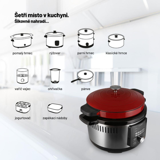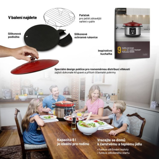 Všestranný pomocník pre modernú domácnosťViacúčelový Lauben OvenSafe® Multicooker 6000RS rozhodne nerobí hanbu svojmu označeniu. Vnútorný hrniec je poctivý liatinový so smaltovaným povrchom - ako od babičky! Vďaka technológii OvenSafe® je možné ho bez obáv vložiť do rúry či postaviť na rôzne typy sporákov, zvláda teplotu až 250°C. Pretože je 21. storočie v plnom prúde, nádobu s objemom 6 l je možné vložiť aj do multicookeru a razom máte k dispozícii 10 prednastavených programov pre jednoduché a rýchle varenie. Teplotu a čas je však možné upraviť aj ručne. Dôležitou súčasťou hrnca je pokrievka, tá je navrhnutá tak, aby k distribúcii vlhkosti vo vnútri dochádzalo rovnomerne. Liatina dokonale absorbuje a vedie teplo a tým je varenie energeticky úspornejšie, smaltovaný povrch zabraňuje korózii. Jedlo pripravíte ľahko aj v pare vďaka priloženému paráčiku. Šikovnými pomocníkmi sú funkcia na udržiavanie teploty a dložený štart. Manipuláciu uľahčujú priložené silikónové rukavice a podložka, inšpiráciu prináša kuchárka.