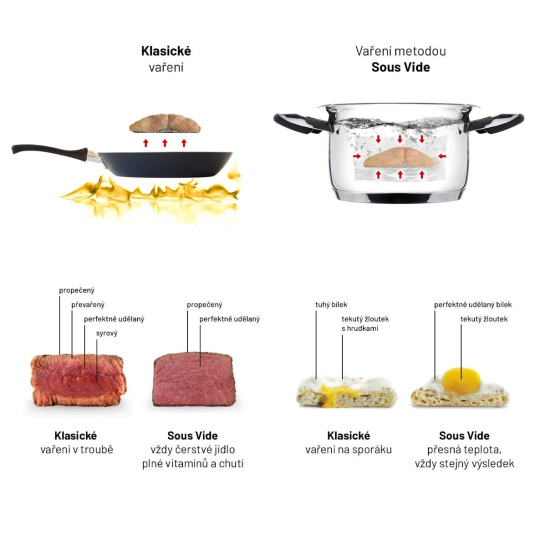 Vďaka metóde sous vide nikdy neprídete o cenné vitamíny a živiny z ingrediencií pokrmov. Príprava navyše prebieha len s malým množstvom tuku. Nielenže získate z jedla maximum pri minimálnom úsilí, ale v porovnaní s klasickými metódami varenia nepotrebujete do jedla pridávať nezdravé tuky, ktoré sú inak nevyhnutné pri príprave.