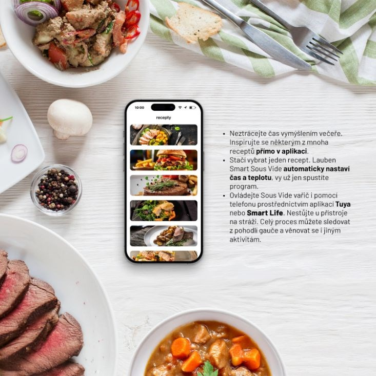 Ovládanie Lauben Smart Sous Vide je hračka, a to aj vďaka možnosti ovládania cez aplikácie Tuya alebo Smart Life. Vďaka tomu máte všetko pod kontrolou – aktuálnu teplotu, zostávajúci čas a môžete sa dokonca inšpirovať mnohými receptami priamo v aplikáciách. Pre tých, ktorí preferujú klasiku, je k dispozícii aj dotykový displej. Nemusíte byť žiadny odborník, aby ste s týmto varičom vykúzlili kulinárske majstrovské diela. Stačí načítať QR kód na obale a behom chvíle sa naučíte všetko potrebné vďaka prehľadnému video návodu. A čo viac, Lauben Sous Vide sa stane nielen praktickým pomocníkom, ale aj štýlovým doplnkom vašej kuchyne vďaka svojmu elegantnému dizajnu.