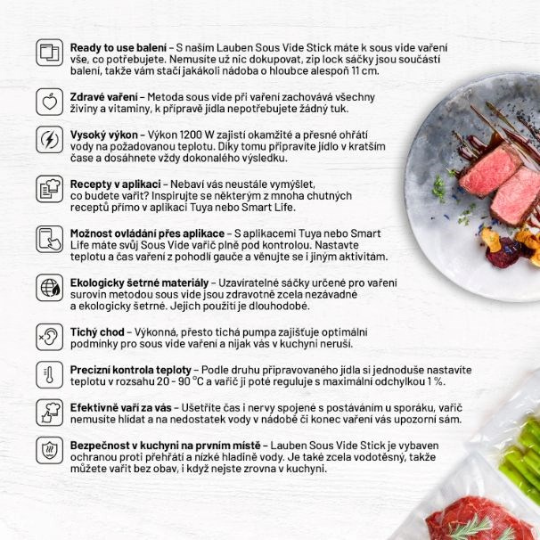 Vďaka špeciálnej metóde sous vide, ktorá je založená na príprave jedál pri nižších teplotách vo vákuu, si všetky pokrmy zachovajú svoj pôvodný tvar a farbu. S Lauben Smart Sous Vide sa vám nikdy nestane, že by ste jedlo pripálili, rozvarili alebo zkazili. Čerstvosť a všetky chute aj vône v ingredienciách zostanú. Preto túto metódu využívajú šéfkuchári v michelinských reštauráciách. Vy si môžete takto uvariť aj doma, príprava vám nezaberie takmer žiadny čas a varič všetko ohlási za vás.