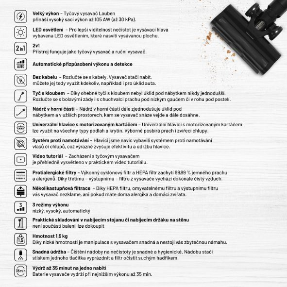 Vysaje každý povrch s minimálnym úsilímRýchle a efektívne upratovanie nemusí byť len snom. Stačí si zabezpečiť šikovných pomocníkov. Medzi nich patrí aj Lauben Stick Vacuum 2in1 Pet Plus 400BC s vysokým sacím výkonom až 105 AW, ktorý automaticky prispôsobí stupeň znečistenia. Nečistoty sú ešte lepšie viditeľné vďaka LED osvetleniu vysávanej plochy. Umiestnenie zbieracej nádoby v hornej časti spolu s flexibilnou tyčou s kĺbom umožňuje jednoduché vysávanie aj pod nábytkom či na úzkych miestach, následne nádobu vyprázdite úplne hygienicky. Veľmi praktická je hlavica so systémom proti zamotávaniu vlasov a zvieracích chlpov a univerzálny motorizovaný kefka na všetky typy podláh. Tyčový vysávač okamžite premeníte na ručný vysávač, bezdoknové prevedenie umožňuje používanie kdekoľvek. Prístroj sa pýši štýlovým dizajnom a návodný video tutoriál demonštruje správne zaobchádzanie s vysávačom.