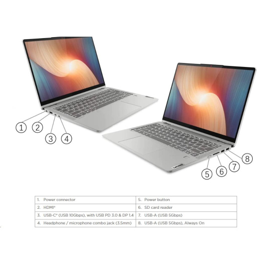 | Standartné porty | 1x USB-A (USB 5Gbps / USB 3.2 Gen 1), Always On 1x USB-C® (USB 10Gbps / USB 3.2 Gen 2), with USB PD 3.0 and DisplayPort™ 1.4 1x USB-A (USB 5Gbps / USB 3.2 Gen 1) 1x HDMI® 1.4b 1x SD card reader 1x Headphone / microphone combo jack (3.5mm) 1x Power connector |