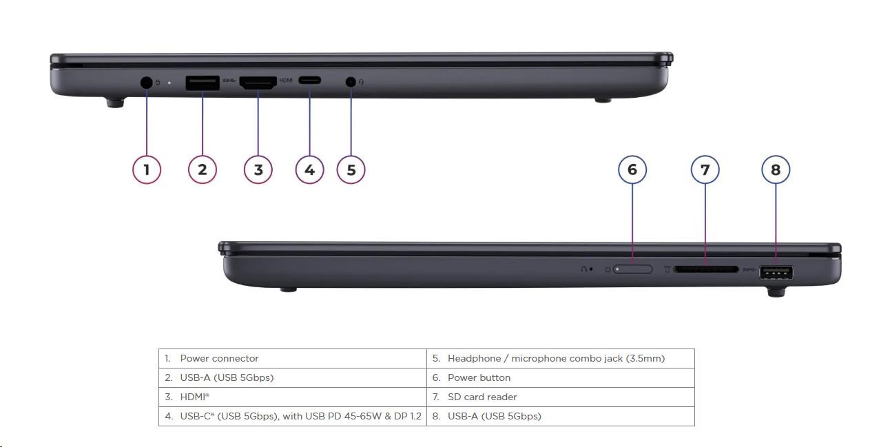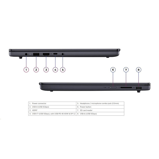 | Standartné porty | 2x USB-A (USB 5Gbps / USB 3.2 Gen 1) 1x USB-C® (USB 5Gbps / USB 3.2 Gen 1), with USB PD 45-65W and DisplayPort™ 1.2 1x HDMI® 1.4 1x Headphone / microphone combo jack (3.5mm) 1x SD card reader 1x Round tip power connector |
