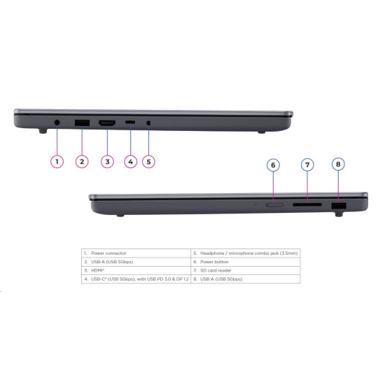 | Standartné porty | 2x USB-A (USB 5Gbps / USB 3.2 Gen 1) 1x USB-C® (USB 5Gbps / USB 3.2 Gen 1), with USB PD 3.0 and DisplayPort™ 1.2 1x HDMI® 1.4 1x Headphone / microphone combo jack (3.5mm) 1x SD card reader 1x Power connector |