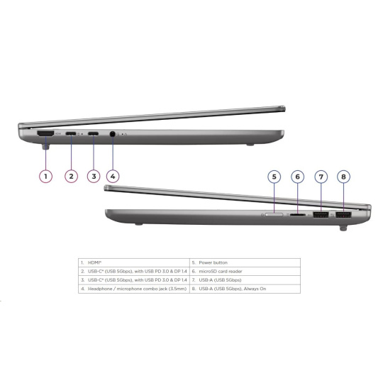 | Standartné porty | 1x USB-A (USB 5Gbps / USB 3.2 Gen 1) 1x USB-A (USB 5Gbps / USB 3.2 Gen 1), Always On 2x USB-C® (USB 5Gbps / USB 3.2 Gen 1), with USB PD 3.0 and DisplayPort™ 1.4 1x HDMI® 1.4b 1x Headphone / microphone combo jack (3.5mm) 1x microSD card reader |