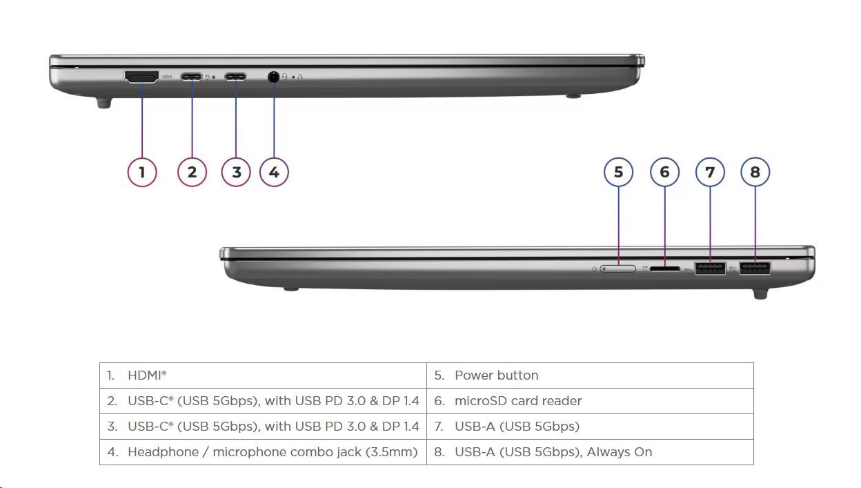 | Standartné porty | 1x USB-A (USB 5Gbps / USB 3.2 Gen 1) 1x USB-A (USB 5Gbps / USB 3.2 Gen 1), Always On 2x USB-C® (USB 5Gbps / USB 3.2 Gen 1), with USB PD 3.0 and DisplayPort™ 1.4 1x HDMI® 2.1, up to 4K/60Hz 1x Headphone / microphone combo jack (3.5mm) 1x microSD card reader |