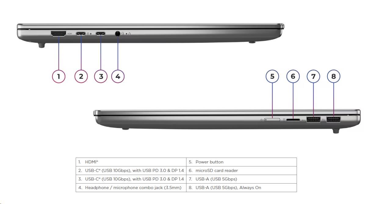 | Standartné porty | 1x USB-A (USB 5Gbps), Always On 1x USB-A (USB 5Gbps) 2x USB-C® (USB 10Gbps), with USB PD 3.0 and DisplayPort™ 1.4 1x HDMI® 2.1, up to 4K/60Hz 1x Headphone / microphone combo jack (3.5mm) 1x microSD card reader |