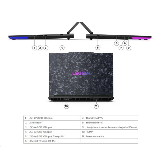 | Standartné porty | 2x USB-A (USB 10Gbps / USB 3.2 Gen 2) 1x USB-A (USB 10Gbps / USB 3.2 Gen 2), Always On 1x USB-C® (USB 10Gbps / USB 3.2 Gen 2) 2x USB-C® (Thunderbolt™ 5 / USB4® Version 2 80Gbps), with USB PD 95-100W and DisplayPort™ 2.1 1x HDMI® 2.1, up to 8K/60Hz 1x Headphone / microphone combo jack (3.5mm) 1x Ethernet (2.5GbE RJ-45) 1x Card reader 1x Power connector |