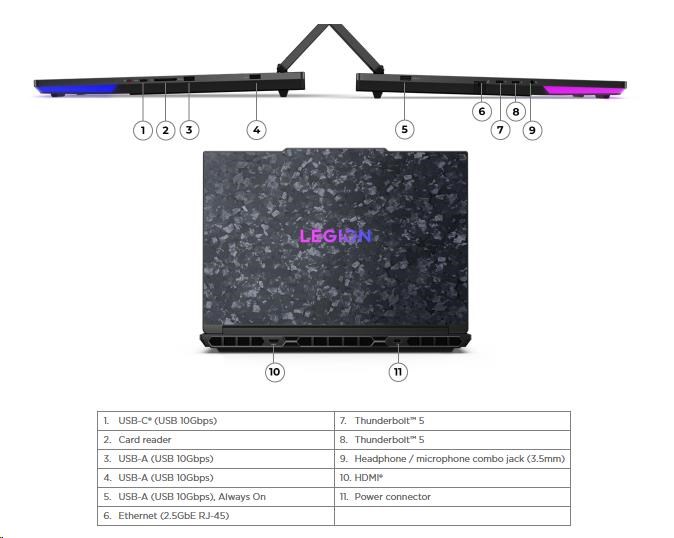 | Standartné porty | 2x USB-A (USB 10Gbps / USB 3.2 Gen 2) 1x USB-A (USB 10Gbps / USB 3.2 Gen 2), Always On 1x USB-C® (USB 10Gbps / USB 3.2 Gen 2) 2x USB-C® (Thunderbolt™ 5 / USB4® Version 2 80Gbps), with USB PD 95-100W and DisplayPort™ 2.1 1x HDMI® 2.1, up to 8K/60Hz 1x Headphone / microphone combo jack (3.5mm) 1x Ethernet (2.5GbE RJ-45) 1x Card reader 1x Power connector |