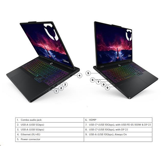 | Standartné porty | 2x USB-A (USB 5Gbps / USB 3.2 Gen 1) 1x USB-A (USB 10Gbps / USB 3.2 Gen 2), Always On 1x USB-C® (USB 10Gbps / USB 3.2 Gen 2), with DisplayPort™ 2.1 1x USB-C® (USB 10Gbps / USB 3.2 Gen 2), with USB PD 65-100W and DisplayPort™ 2.1 1x HDMI® 2.1, up to 8K/60Hz 1x Headphone / microphone combo jack (3.5mm) 1x Ethernet (RJ-45) 1x Slim tip Power connector |