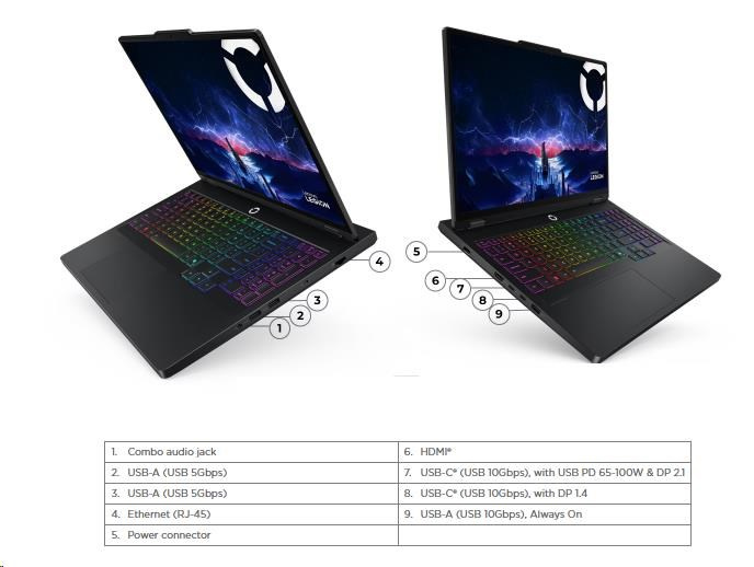 Standartné porty | 2x USB-A (USB 5Gbps / USB 3.2 Gen 1) 1x USB-A (USB 10Gbps / USB 3.2 Gen 2), Always On 1x USB-C® (USB 10Gbps / USB 3.2 Gen 2), with USB PD 65-100W and DisplayPort™ 2.1 1x USB-C® (USB 10Gbps / USB 3.2 Gen 2), with DisplayPort™ 1.4 1x HDMI® 2.1, up to 8K/60Hz 1x Headphone / microphone combo jack (3.5mm) 1x Ethernet (RJ-45) 1x Power connector |