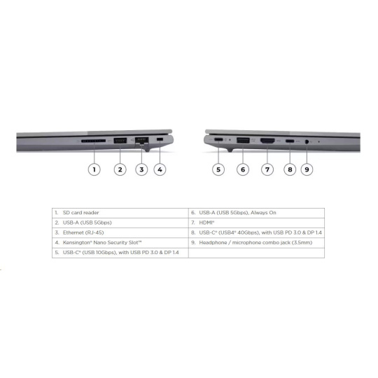| Standartné porty | 1x USB-A (USB 5Gbps / USB 3.2 Gen 1) 1x USB-A (USB 5Gbps / USB 3.2 Gen 1), Always On 1x USB-C® (USB 10Gbps / USB 3.2 Gen 2), with USB PD 3.0 and DisplayPort™ 1.4 1x USB-C® (USB4® 40Gbps), with USB PD 3.0 and DisplayPort™ 1.4 1x HDMI® 2.1, up to 4K/60Hz 1x Headphone / microphone combo jack (3.5mm) 1x Ethernet (RJ-45) 1x SD card reader |