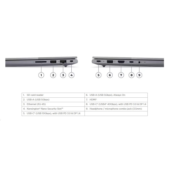 | Standartné porty | 1x USB-A (USB 5Gbps / USB 3.2 Gen 1) 1x USB-A (USB 5Gbps / USB 3.2 Gen 1), Always On 1x USB-C® (USB 10Gbps / USB 3.2 Gen 2), with USB PD 3.0 and DisplayPort™ 1.4 1x USB-C® (USB4® 40Gbps), with USB PD 3.0 and DisplayPort™ 1.4 1x HDMI® 2.1, up to 4K/60Hz 1x Headphone / microphone combo jack (3.5mm) 1x Ethernet (RJ-45) 1x SD card reader |