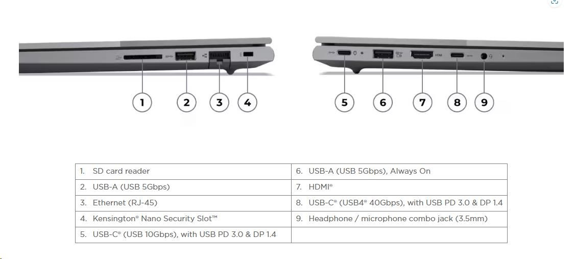 Standartné porty | 1x USB-A (USB 5Gbps / USB 3.2 Gen 1) 1x USB-A (USB 5Gbps / USB 3.2 Gen 1), Always On 1x USB-C® (USB 10Gbps / USB 3.2 Gen 2), with USB PD 3.0 and DisplayPort™ 1.4 1x USB-C® (USB4® 40Gbps), with USB PD 3.0 and DisplayPort™ 1.4 1x HDMI® 2.1, up to 4K/60Hz 1x Headphone / microphone combo jack (3.5mm) 1x Ethernet (RJ-45) 1x SD card reader |